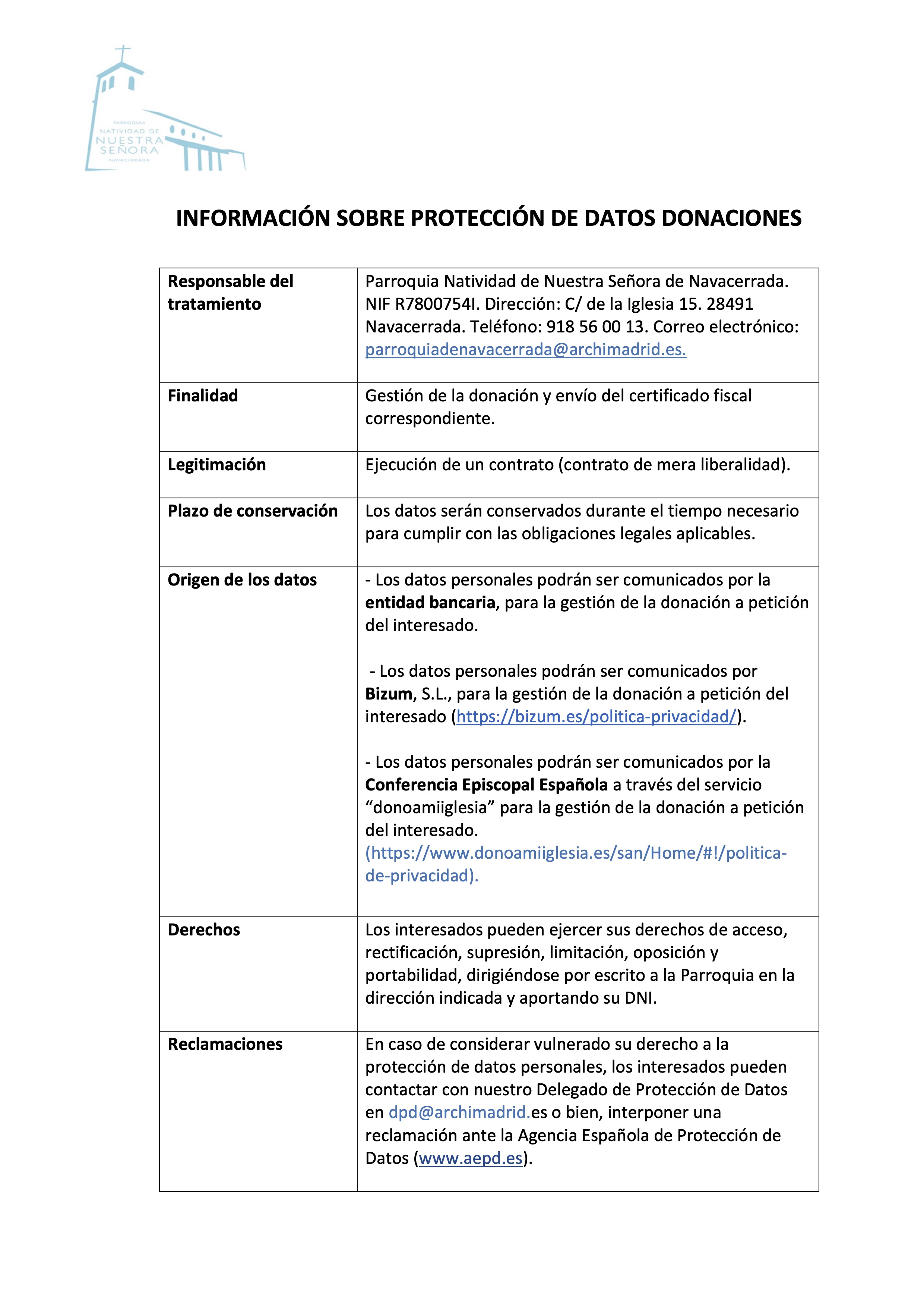 Le informamos conforme a lo previsto en el RGPD de 27 de abril de 2016 que DIGIC STRATEGY CONSULTING, S.L., recaba y trata sus datos de carácter personal, aplicando las medidas técnicas y organizativas que garantizan su confidencialidad, con la finalidad de gestionar la relación que le vincula. Usted da su consentimiento y autorización para dicho tratamiento. Conservaremos sus datos de carácter personal únicamente el tiempo imprescindible para gestionar nuestra relación. Podrá ejercitar los derechos de acceso, rectificación, supresión, limitación, portabilidad y oposición dirigiéndose a parroquiadenavacerrada@archimadrid.es